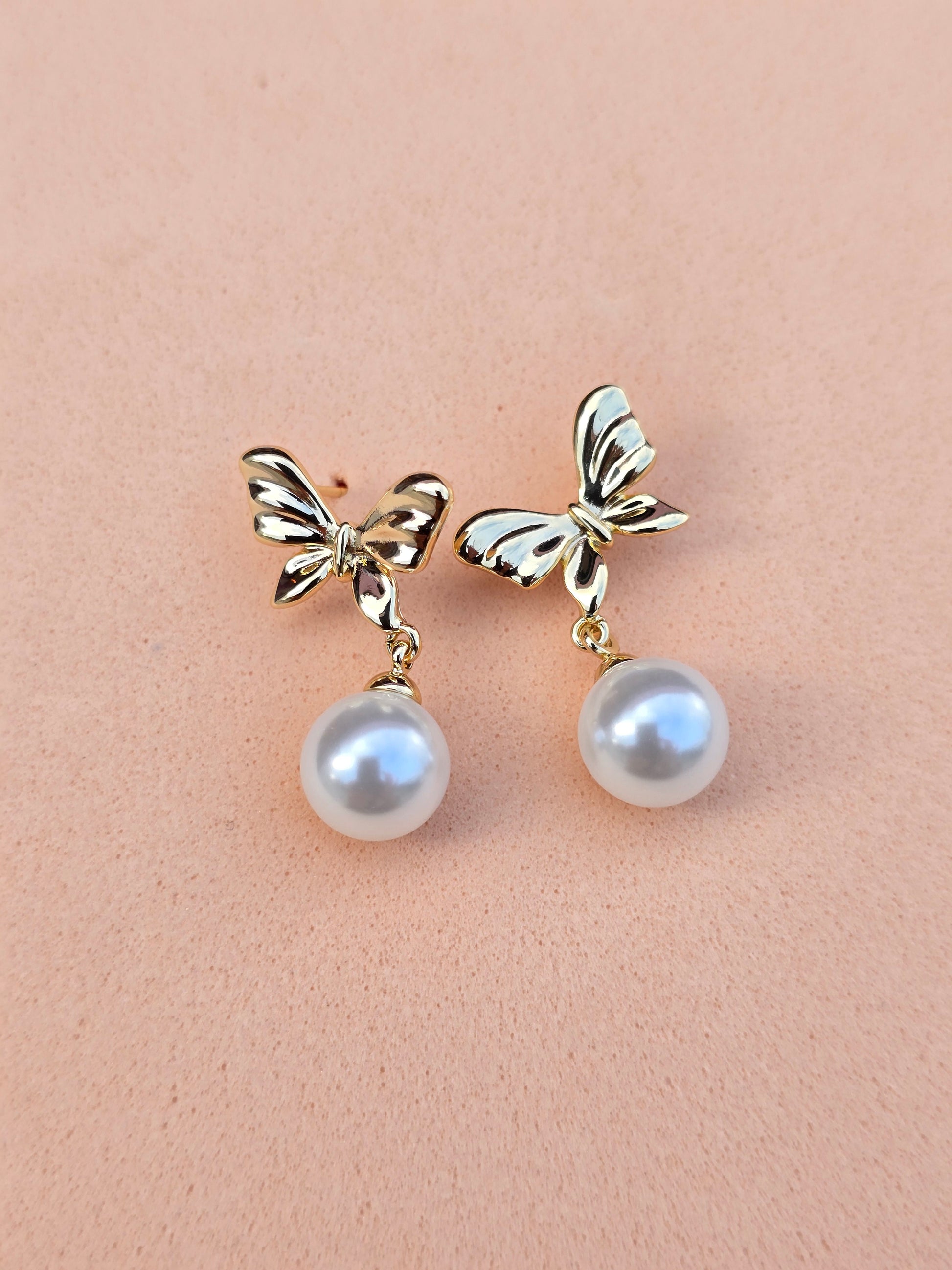 Los Aretes Bella Pearl Butterfly son la combinación perfecta entre dulzura y elegancia. Su diseño presenta una mariposa dorada finamente detallada, de la cual cuelga una perla natural sintética, creando un efecto delicado y brillante.