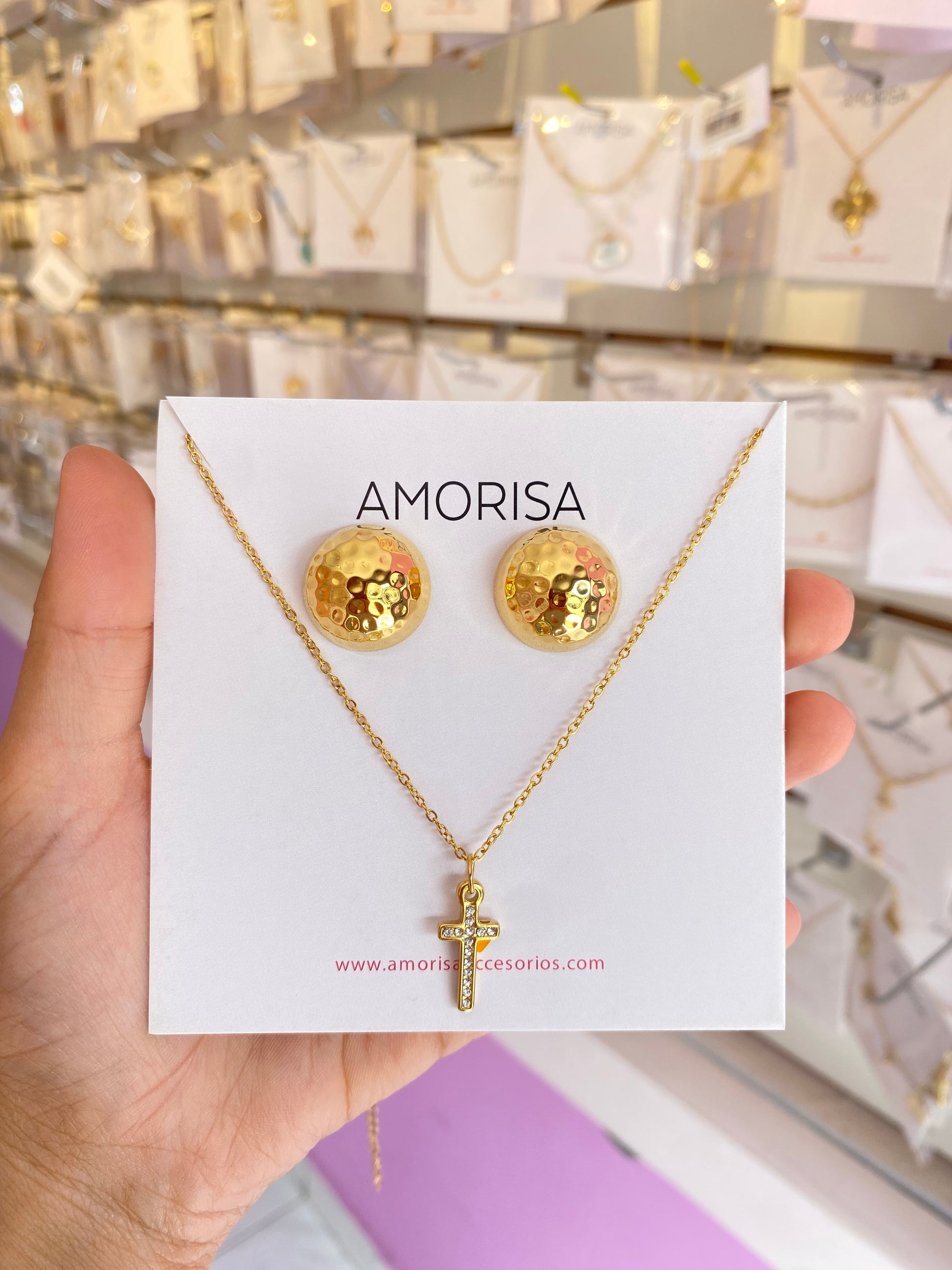 Brilla con elegancia y sutileza con este hermoso set de aretes topo y cadena con cruz de brillo. Un diseño moderno y sofisticado que equilibra la simplicidad con el glamour, perfecto para mujeres que aman los accesorios delicados pero con presencia.