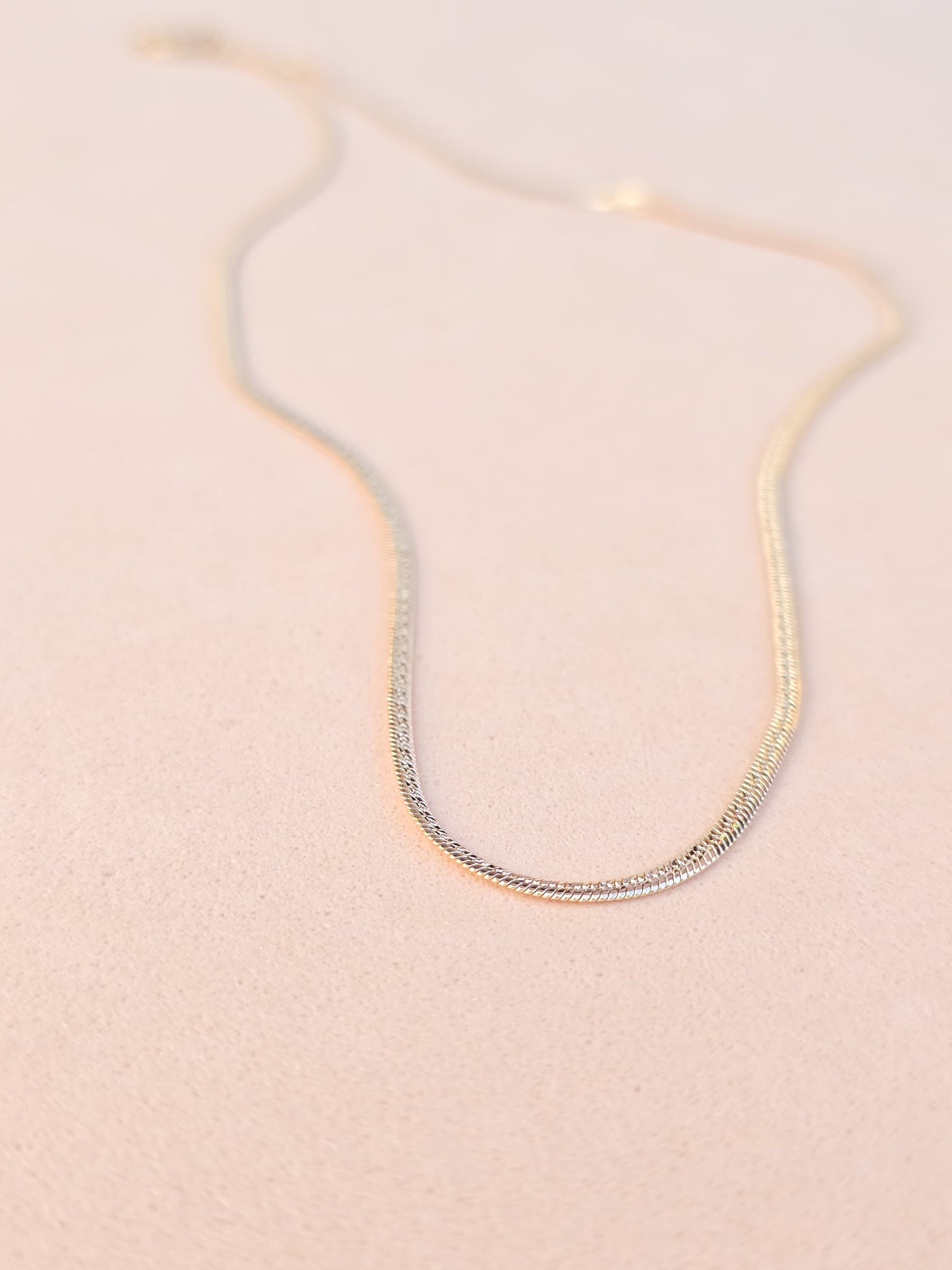 La Cadena Delya Flat de 60 cm combina sofisticación y versatilidad, con su diseño serpiente plano que refleja la luz con cada movimiento. Elaborada en aleación de cobre premium con baño en oro 18K, cuenta con capa protectora antihumedad y antialérgica, que mantiene su brillo y color por más tiempo.