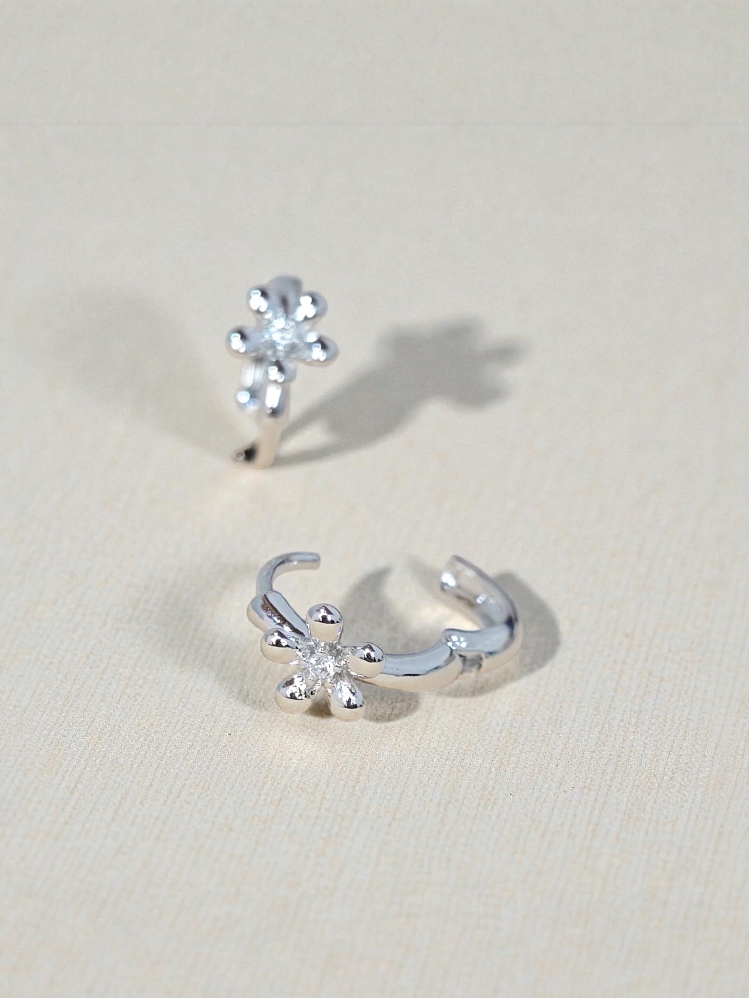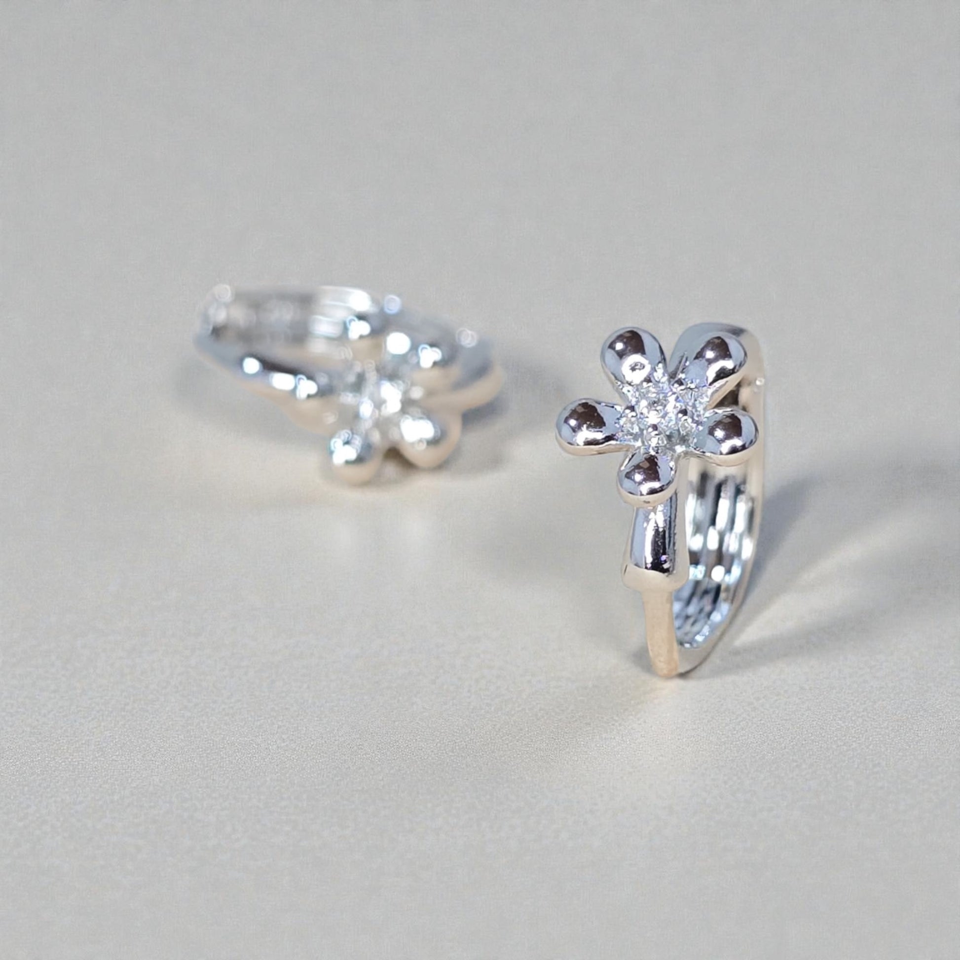 Candonga plateada con delicada flor adornada con circones brillantes, elaborada en covergold hipoalergénico con capa 18K y protección antihumedad. Su diseño femenino y elegante aporta un toque sofisticado y brillante, perfecto para cualquier look diario o especial.